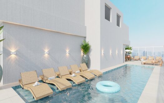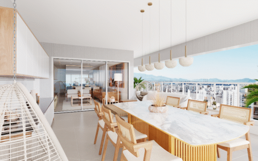 Os apartamentos contam com churrasqueira a gás, fechadura eletrônica, chuveiros com opção de aquecimento a gás, forro de gesso em todos os ambientes e piso do terraço nivelado com a sala e a cozinha, reforçando a integração dos espaços e a funcionalidade do layout. O empreendimento também se destaca pela fazenda solar instalada na cobertura, contribuindo para eficiência energética.